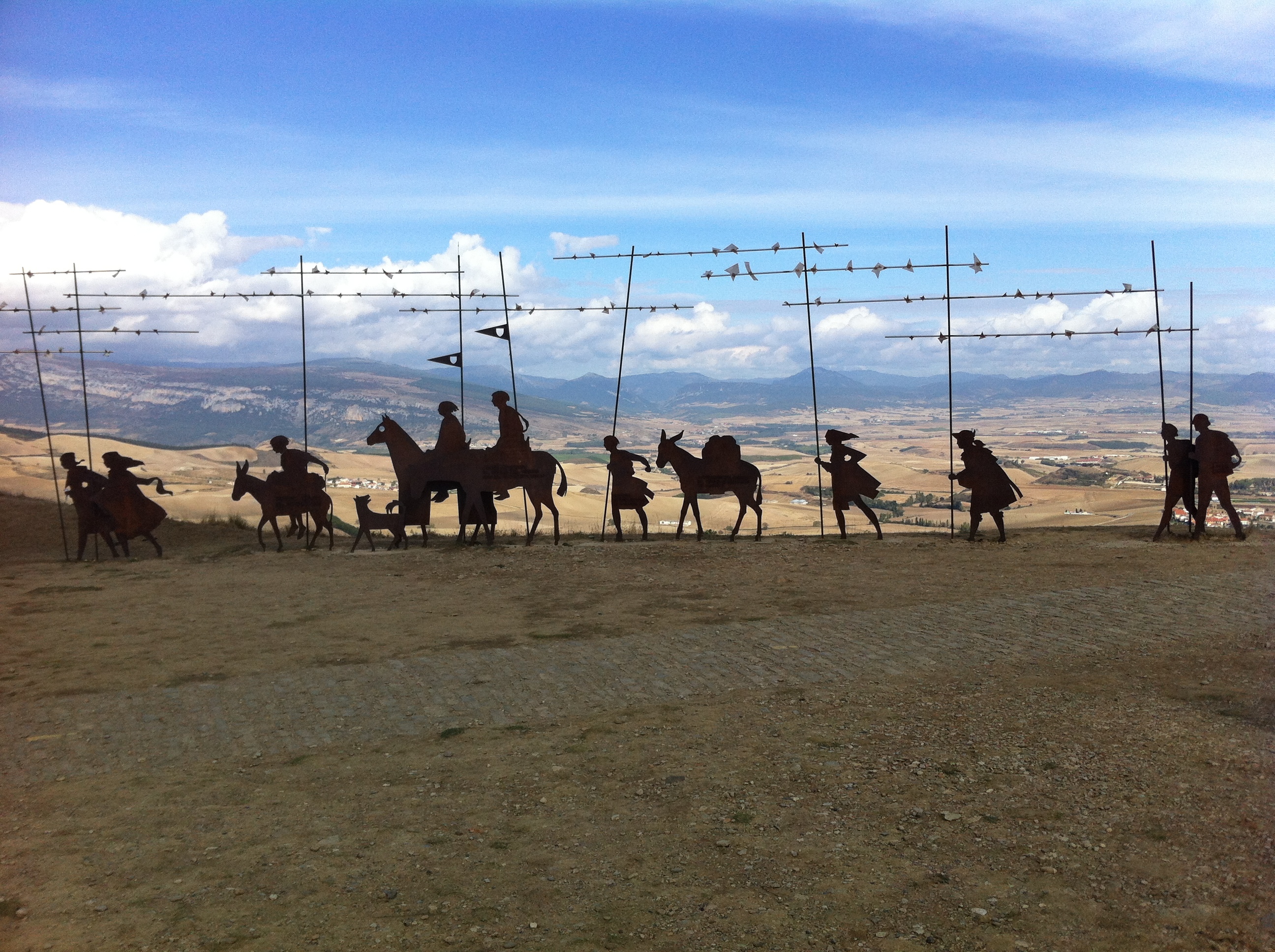 We climbed a peak named Alto del Perdon where there was a big wind farm and a wrought iron feature representing medieval pilgrims , heads bent into the west wind . We then descended into a different landscape of vineyards and what appears to be very fertile land. I passed almond and walnut trees ( many of the almond trees had Mistletoe growing on them ) , fields full of white asparagus , maize and large red chilies. The Red Kites are a familiar sight and I will post a video if I get a close up.