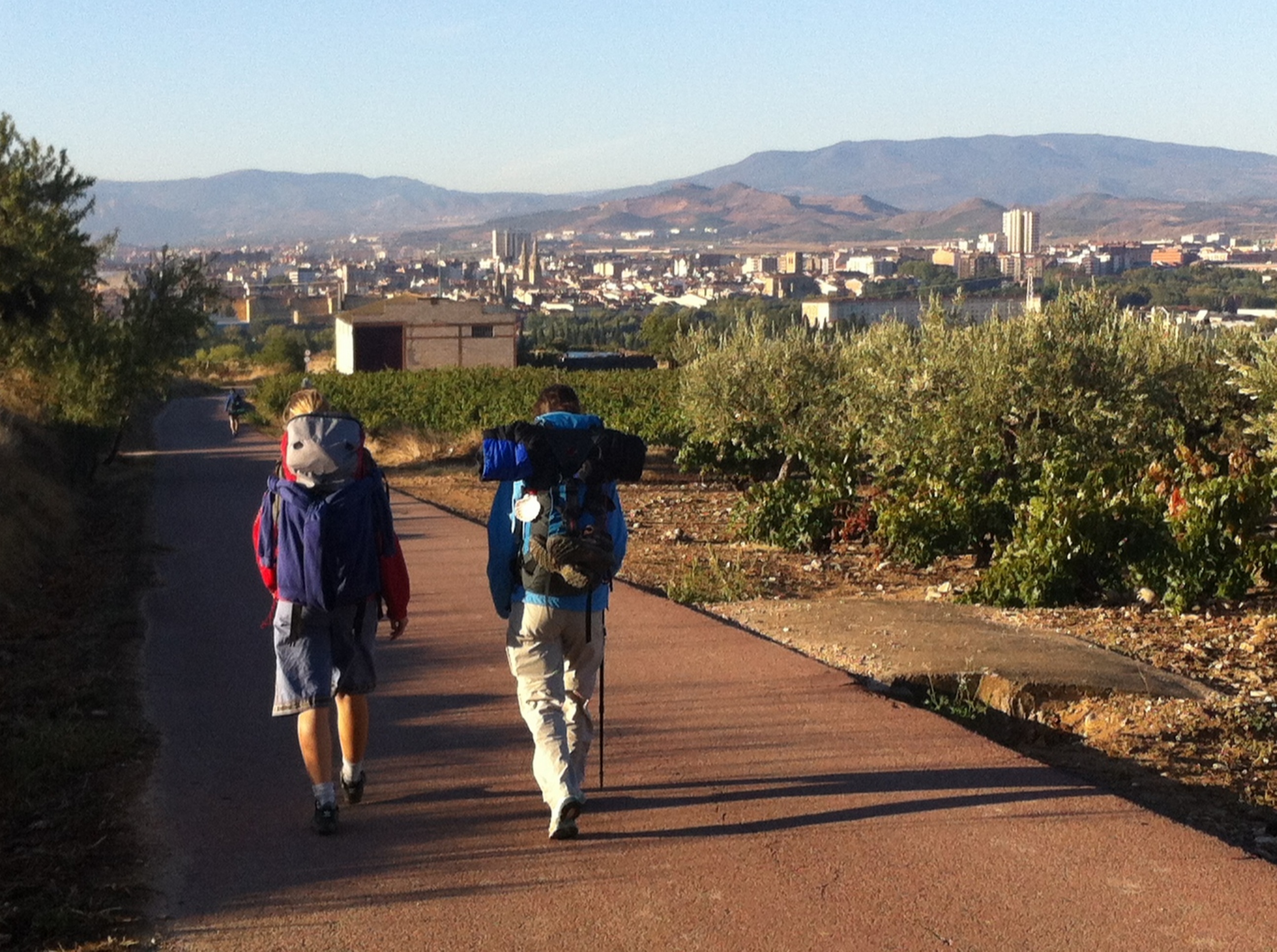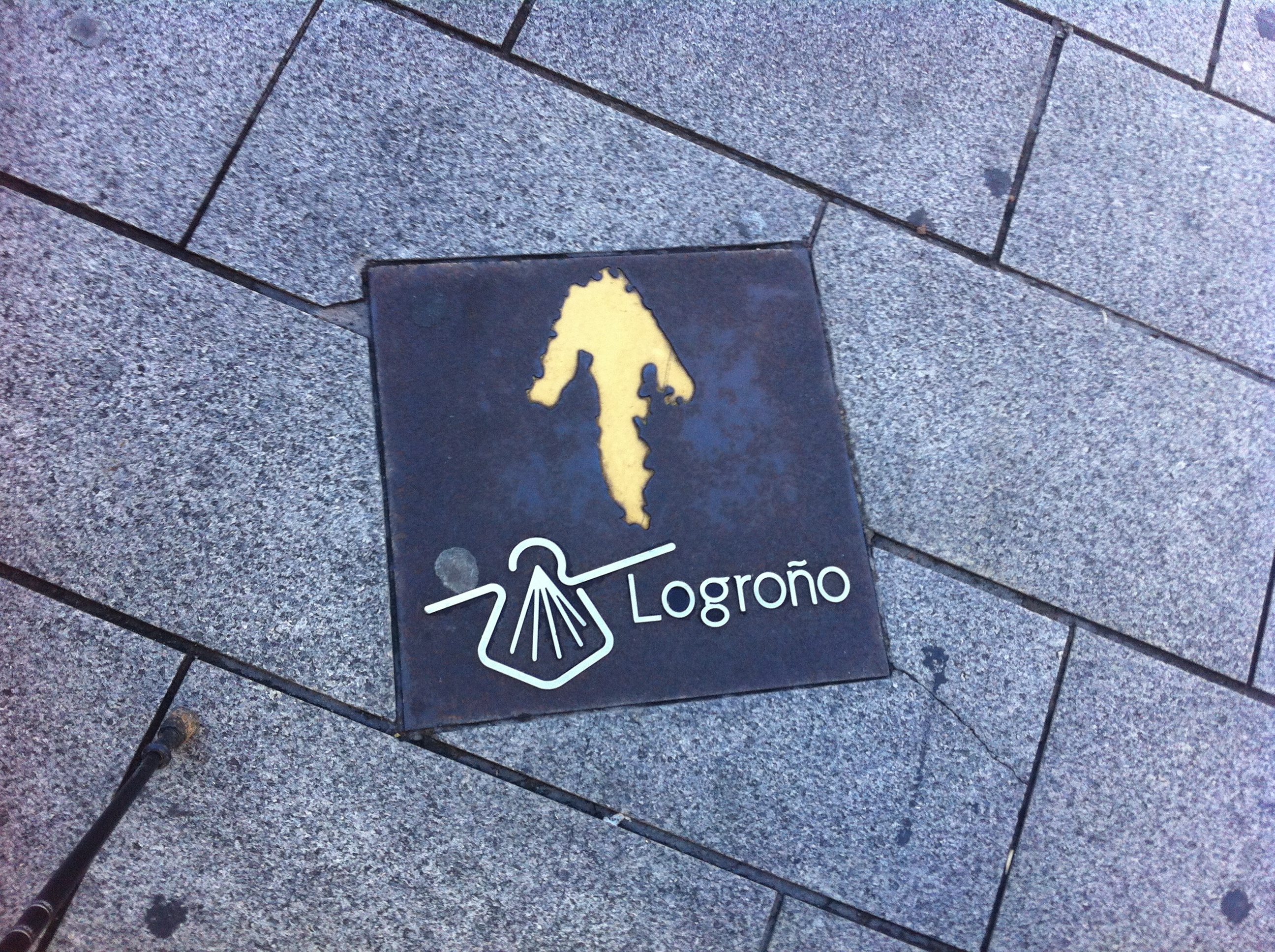 After the restless night in Viana I left the Refugio around 7.45am and passed my emphysematous Catalan friend having his first drag of the day. I walked alone for the first few km and left the Navarra region behind , crossing into La Rioja , the famous wine growing area. Just before reaching the City of Logrono I wandered off down a riverside path for half a mile or so before I realised that the yellow arrows had disappeared. I think I was distracted by the rising fish in the river ( The Ebro ). Not for the first time on this trip I wished I had brought a travel rod and a few flies. I regained my bearings and followed the ” flecha amarilla ” back into the City proper. Logrono is quite a large city ( pop 130,000 ) and is the capital of La Rioja region. Not far from here is Clavijo , the site of the famous battle where , legend has it , Santiago appeared on his white charger and turned the battle in favour of the Spaniards over the occupying Moors in 844 , thus earning the epithet ” Santiago the Moorslayer “. Not the saintliest of titles , one has to admit.