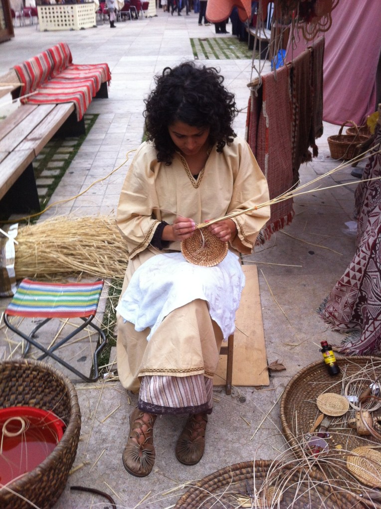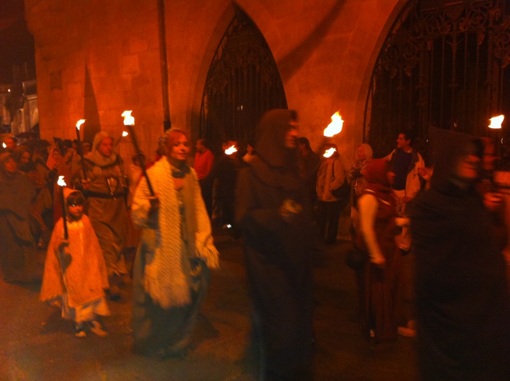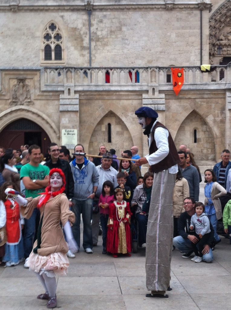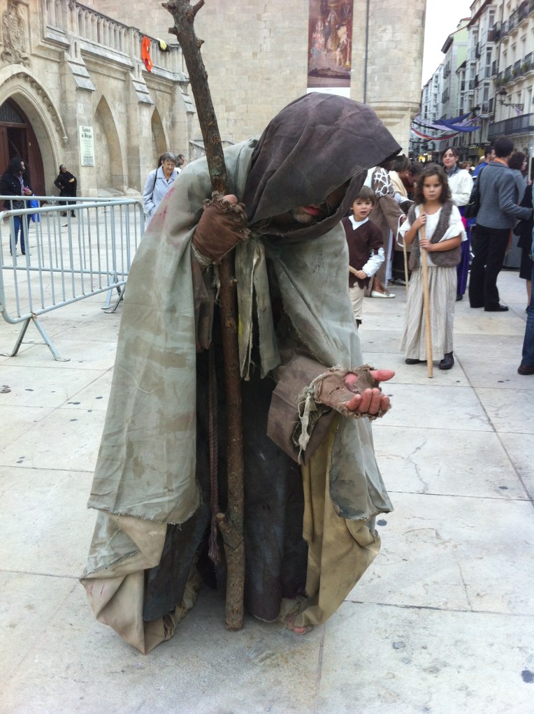 The festivities seemed to centre on El Cid ( who was born near the city ) and there was a medieval theme to it all. Every other person seemed to be dressed in medieval costume , the children too. There was a concert of classical and regional music outside the Cathedral in the morning. Throughout the day there were ” knights” jousting and stick fighting down by the river. There were costumed basket weavers , blacksmiths , puppet makers and others. A bunch of musicians wandered the city all day playing the Spanish version of the bagpipes and drums . All in all it provided a terrific atmosphere and the place was teeming with visitors. In the evening there was a great torchlit procession of all the costumed people and the horses through the city.