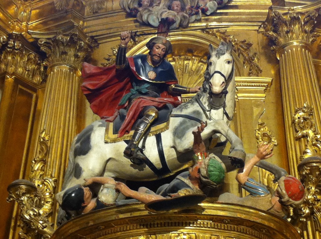Earlier in the day I’d come across Conor , Sylvia ( the Mexican lady who’d slept on the mats with me in Viana ) and Jolante having a coffee in the square. Conor had arrived in the morning and was ending his walk after completing 1000km from Le Puy. We arranged to attend the Pilgrims Mass at 7.30pm in the Cathedral ( this is a daily event at which the Priest gives the Pilgrims a blessing ). The service took place in one of the many chapels within this amazing structure and there were a good few Pilgrims there ( of all faiths ) as well as local people. Whilst the service was going on I was admiring yet another incredibly ornate guilded altarpiece when I noticed our old friends the cock and the hen ( see below ) . This time they were in representative form at the feet of San Domingo. Crowning the altarpiece was yet another gruesome statue of Santiago ” Matamoros ” slaying a few more Moors.