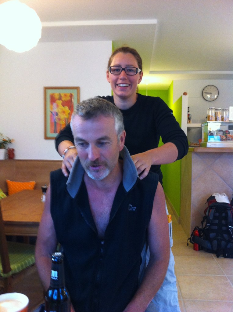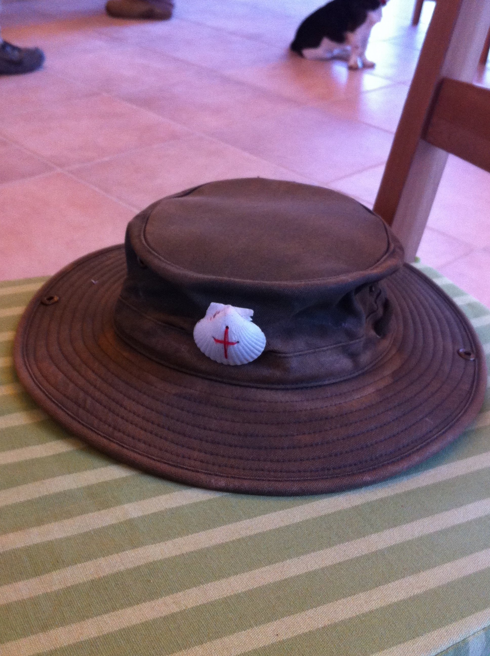 When I rose at 7.00am I was more than usually numb below the waist and I also noticed that I’d gotten my first blister after 250 miles. My body was sending me messages so a short day was planned. I set off walking with John , a group of Germans and a big Austrian guy who would make a good Templar Knight. This guy had a hand held GPS device and was keen to go ” off piste ” so that he could miss some of the roadside paths , the so called ” senda”. We took his lead and followed a path through fields that was certainly more scenic though longer , not helped by the fact that we had to remove our boots and socks to ford a river that didn’t show up on his GPS. I got chatting to the Austrian guy who told me he had already walked 1100km from Le Puy. His intention was to walk not just to Santiago but onward to The Camino Portugues , then walk further to the south coast of Spain , catch a ferry over to Morocco and continue walking. I asked him why he was walking The Camino and he told me a tragic tale. His wife had been killed in a road traffic accident 18 months previously , 6 months before she had been due to qualify as a doctor. He had been so depressed thereafter that he’d though often of taking his own life. He said it was only the thought of the upset it would cause his Mother that had stopped him. So for him The Camino was a form of therapy and after 6 weeks of walking and talking to other Pilgrims he said he felt much better. I’ve heard a few sad stories on The Camino so far but I think that’s the saddest yet.