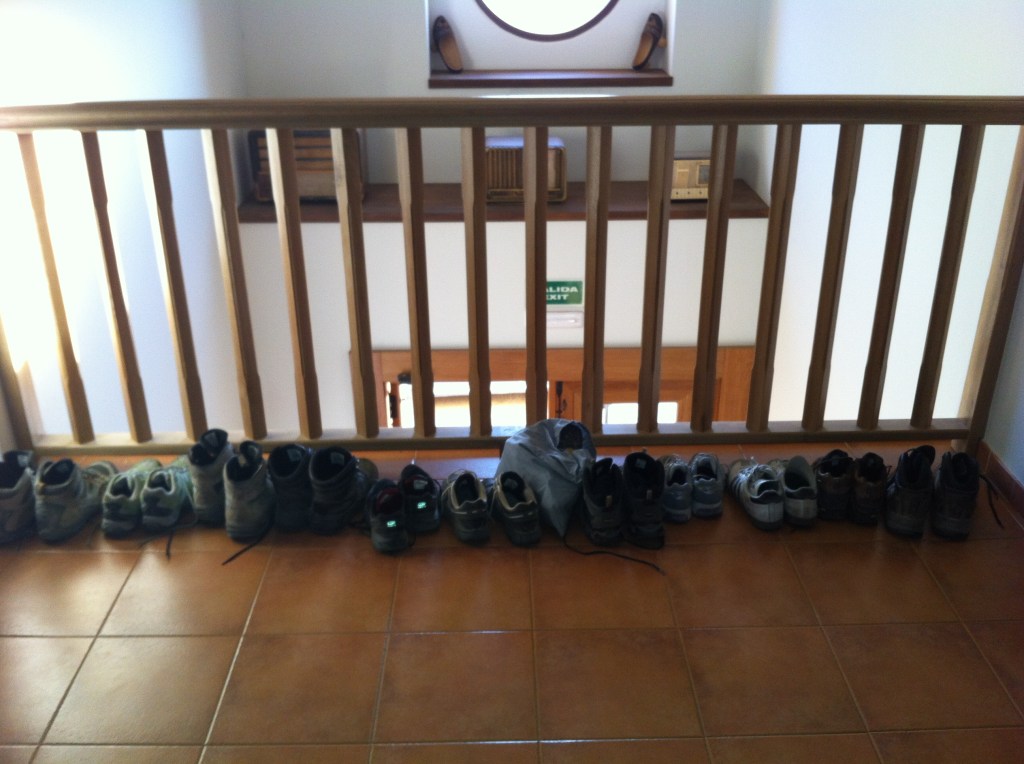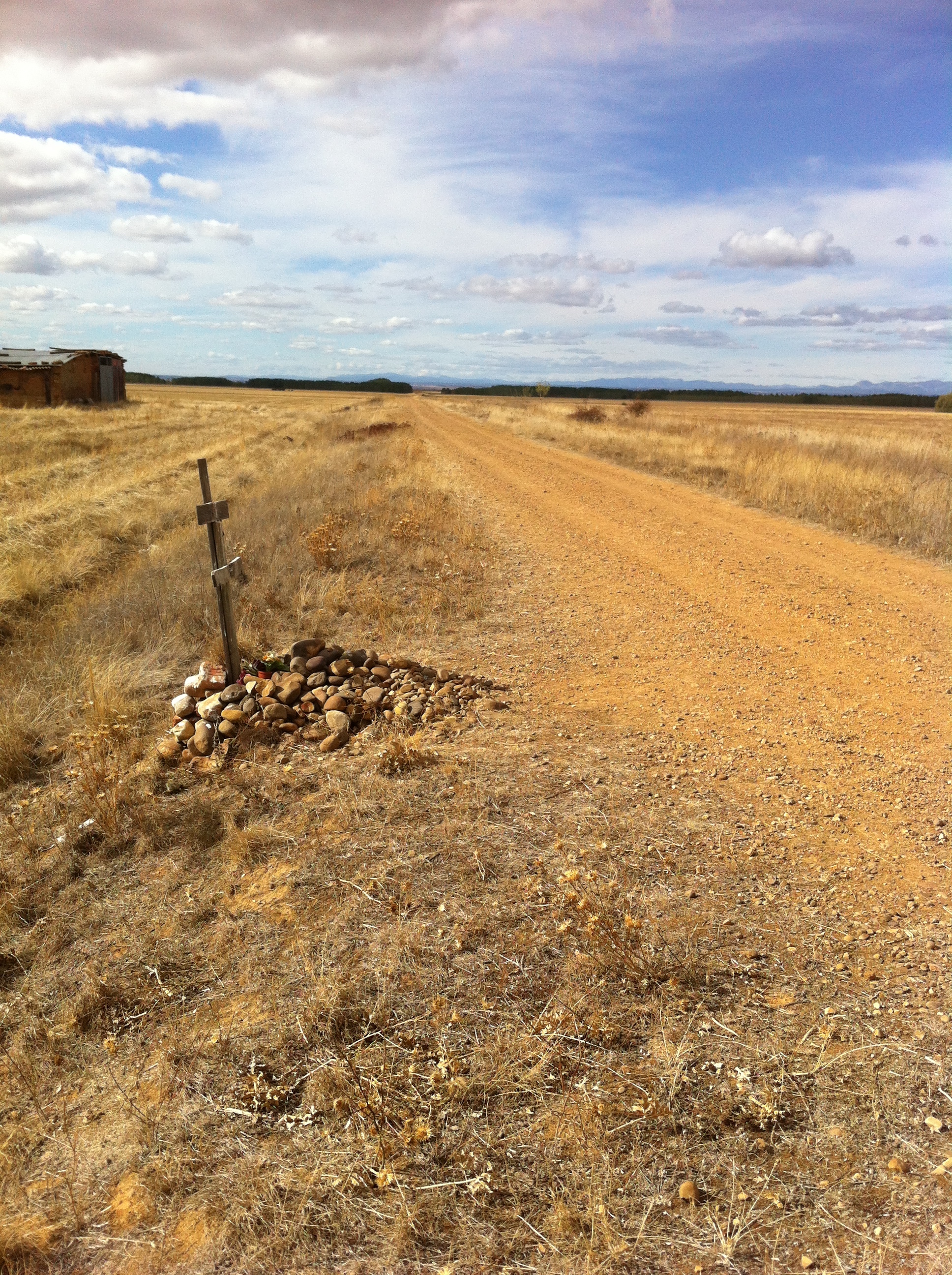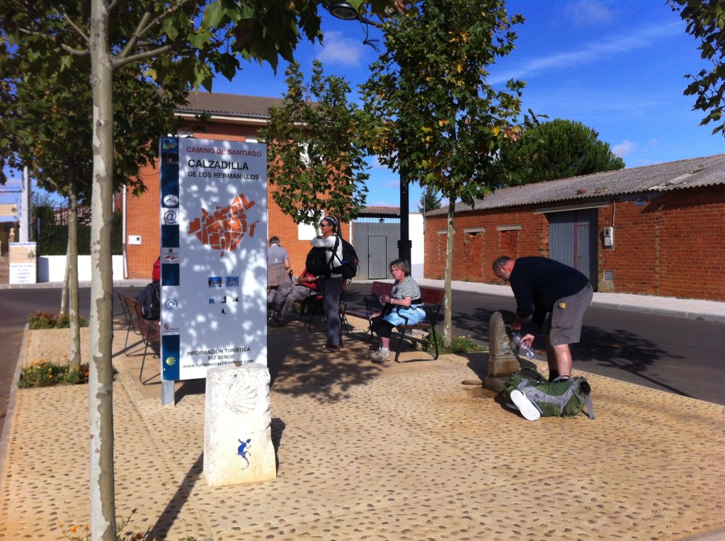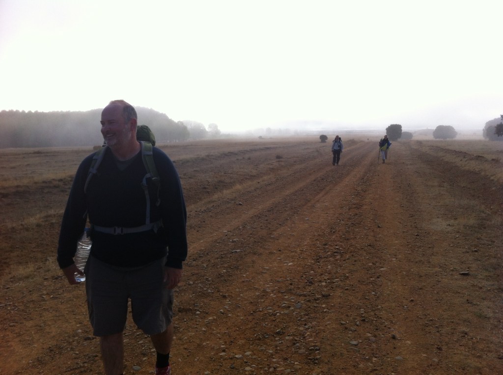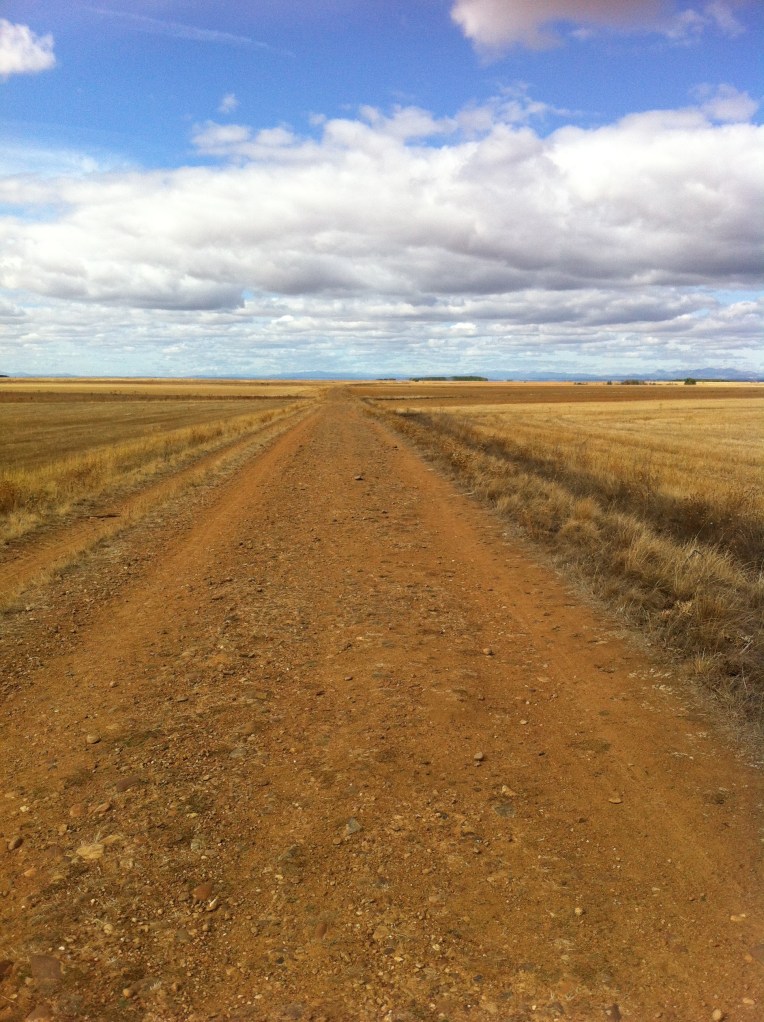 I walked this morning with Forrest and a couple from Nashville , Tennessee. Forrest is a big bear of a man from Oregon and we seemed to get on very well since we first met and shared a glass or two of Rioja about a week ago. I think we’ll share a few more before Santiago. We walked 14km in the morning and Forrest decided to call it quits after lunch. I pressed on and soon came upon the start of the ” Calzada Romana” . This is classified as the most perfect stretch of Roman road left in Spain today. There was absolutely nothing on this road for 14km so I had total solitude and just the sound of my own footsteps and the occasional bird call. I met Servan and Edith from Nantes having a picnic at the start of the road ( see photo ) and they were the only Pilgrims I saw on this section .There is an alternative roadside route for The Camino at this point and I guess most had taken that to avoid the lack of facilities on the Roman road . Whilst walking today I thought of the many millions of Pilgrims from all over Europe who had walked this very same stretch of road over the centuries and endured so many hardships along the way. They didn’t have the luxury of German made walking boots , showers , Rioja and the ” menu de Peregrinos “. They had also to walk all the way home again after reaching Santiago. And here’s me moaning about snorers. I’m such a wuss.