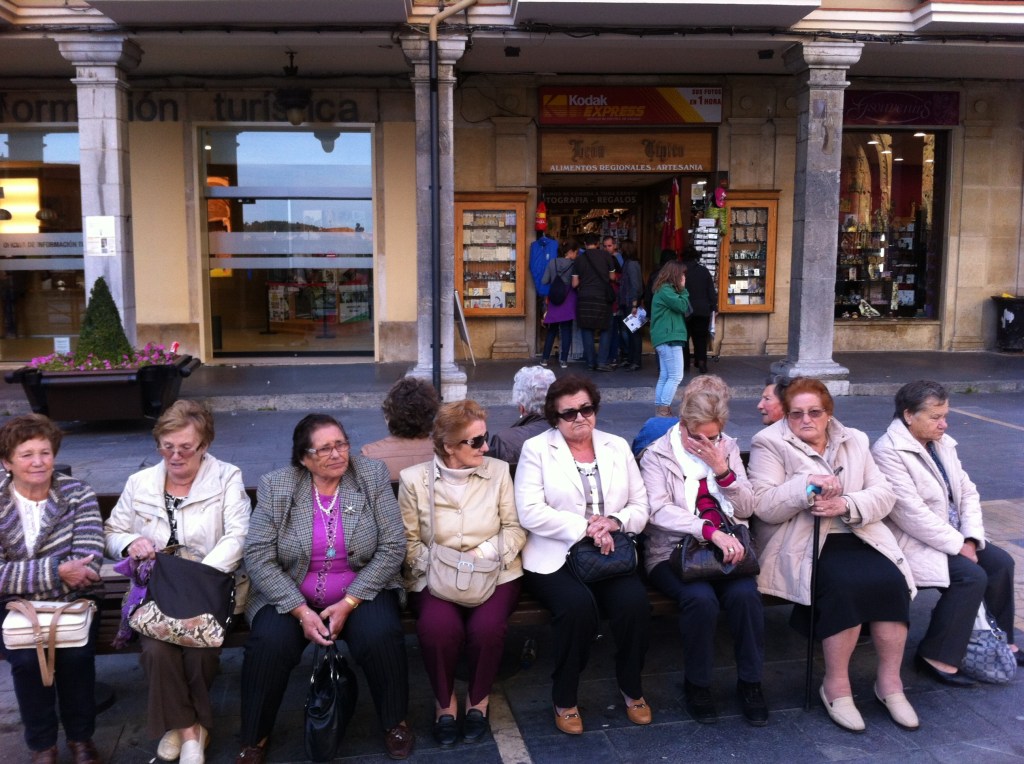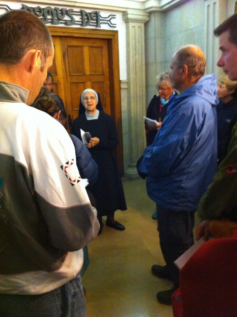 Frustratingly Alain and I had to rush back for the 9.30pm curfew at the Refugio just as the city centre was getting very lively on the last night of the fiesta. When we got back there was a crowd of Pilgrims gathered in the Courtyard waiting for the Nuns to take them to the Pilgrim Benediction in the Convent Chapel. Alain and I tagged along and sat in the Chapel along with around 50 other Pilgrims whilst all the Nuns ( there were 14 of them ) sang prayers and then gave the Pilgrims a blessing . At the end one of the Hospitaleros read out the various Nationalities of the Pilgrims staying with them that night ( we have to show our passports when booking in ) . There must have been about 20 different Nationalities , some from very far flung and unexpected places.