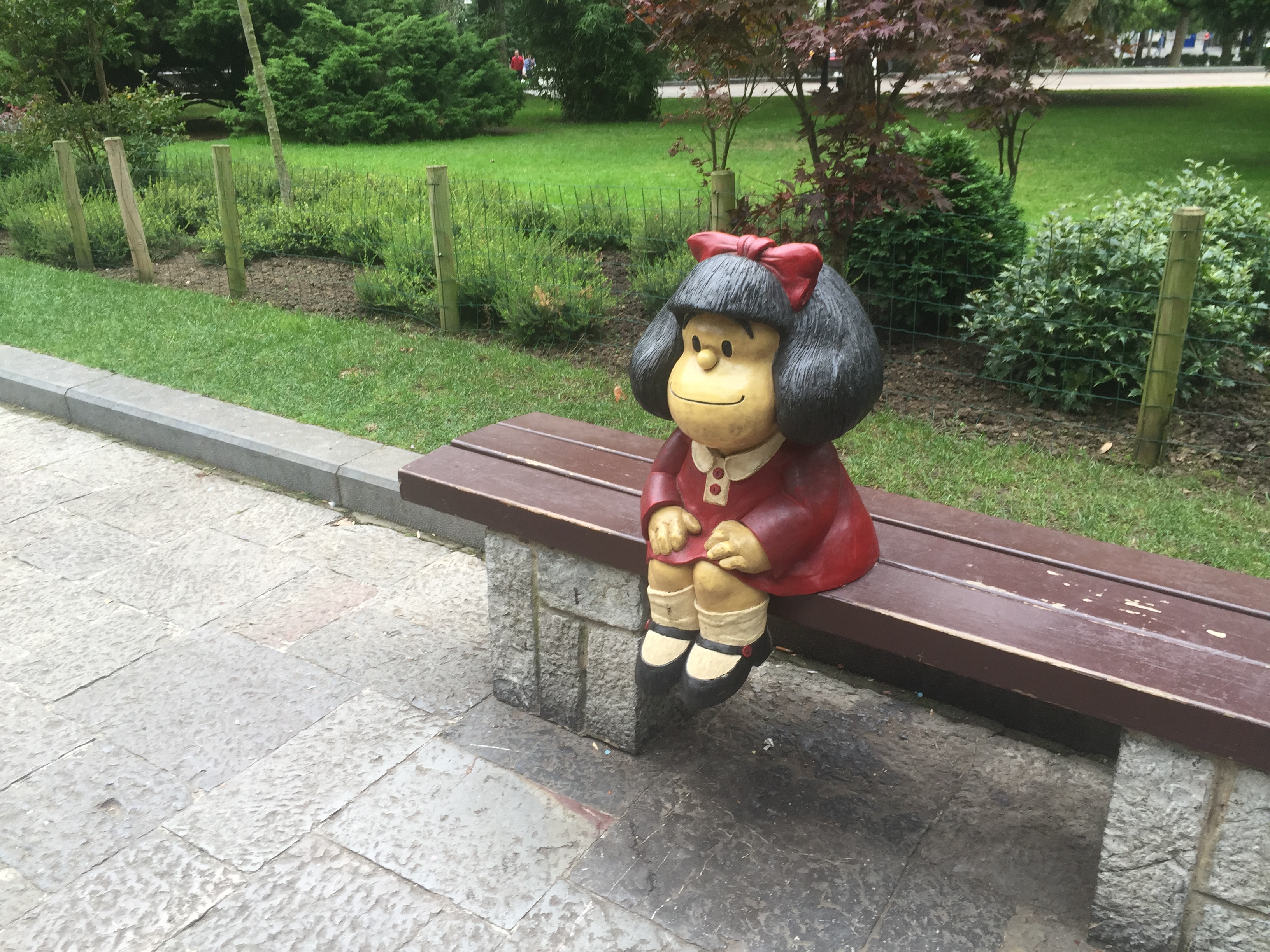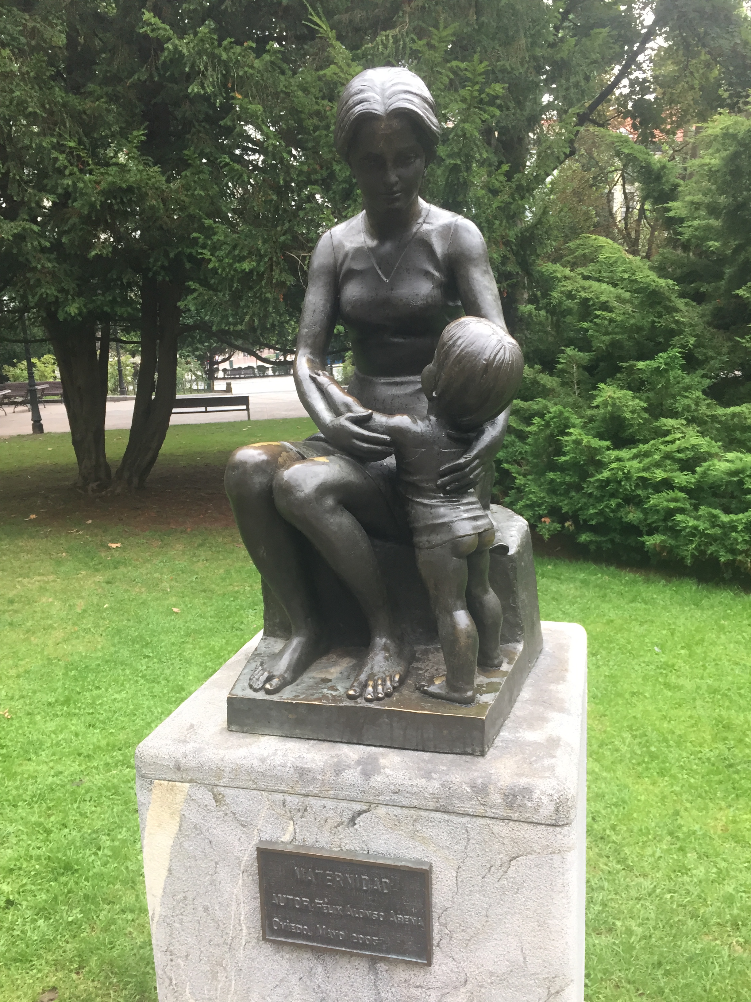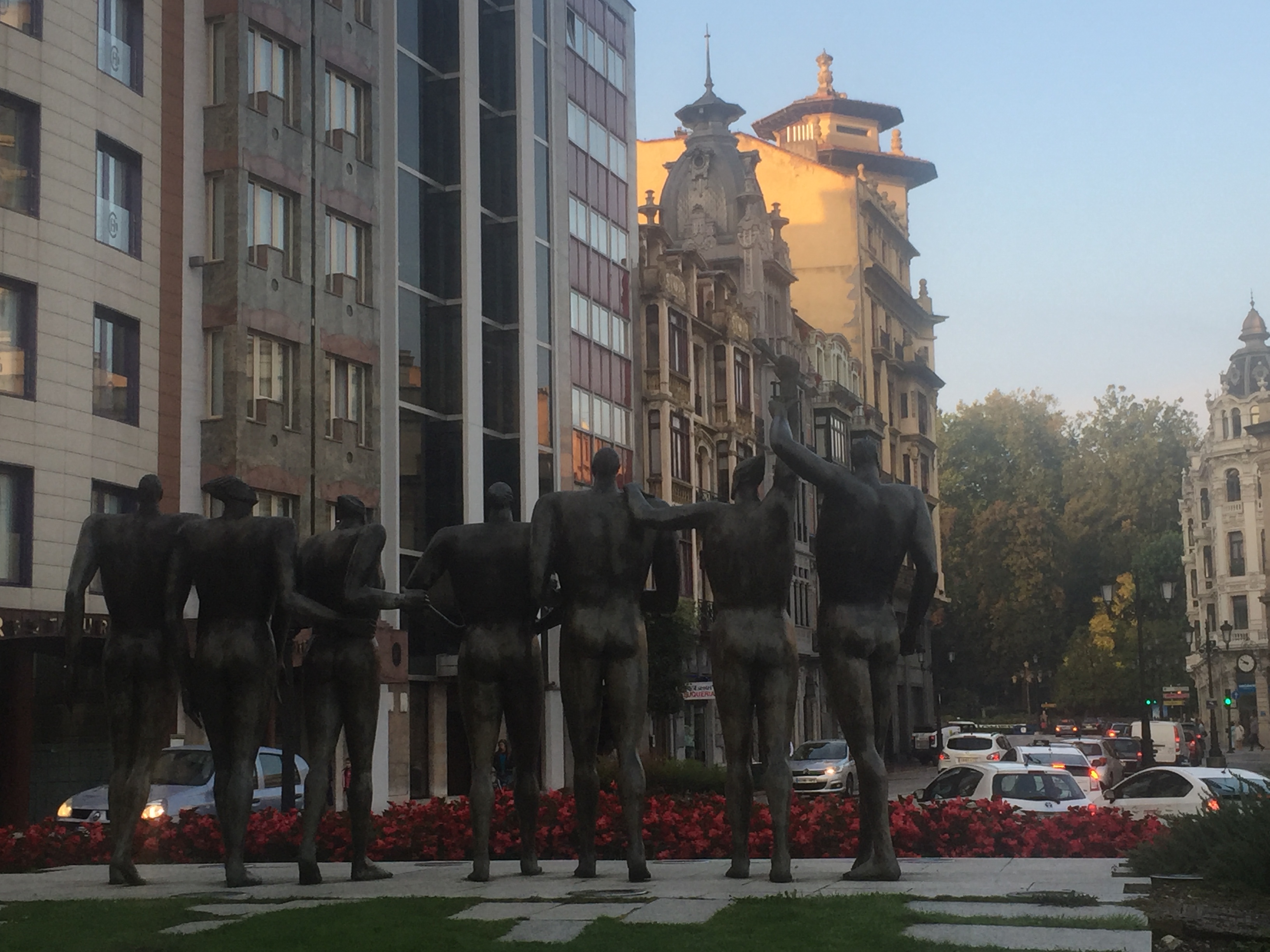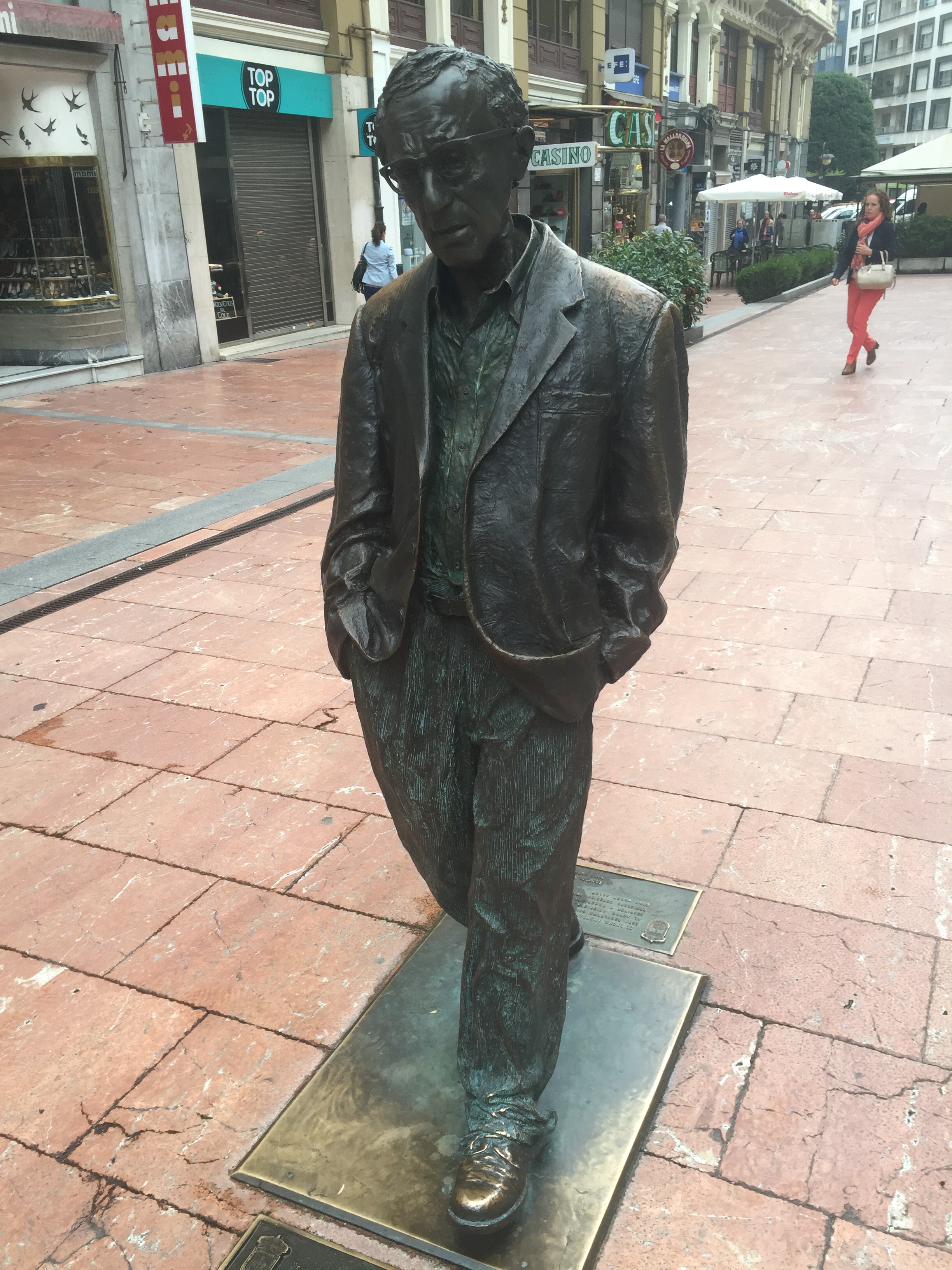 First impressions of Oviedo are that it is a real gem of a small city. There are lots of elegant 19th century buildings and a sprinkling of historic old structures , not least the beautiful Cathedral of San Salvador . There is a definite ” old money ” feel about the place , much like my favourite Spanish city San Sebastian. It is extremely clean ( it’s renowned for this apparently ) and very pedestrian friendly. I had a wander around this morning and noticed the abundance of statues. Someone in authority definitely has a statue fetish as there seemed to be one around every corner and there were lots in the park , including one of an Argentinian cartoon character that was perched on a bench. Just opposite the main park I stumbled across a statue of Woody Allen and my wackiness barometer was going off the scale. I had a look in the guide book and it seems he has had a bit of a love affair with the city having used it as one of the locations for his film Vicky Cristina Barcelona. He is quoted as saying that Oviedo is “a delicious, exotic, beautiful, clean, lovely, tranquil and pedestrianised city. It’s like it doesn’t belong to this world , as if it did not exist.Oviedo is like a fairytale”. No wonder they built him a statue !